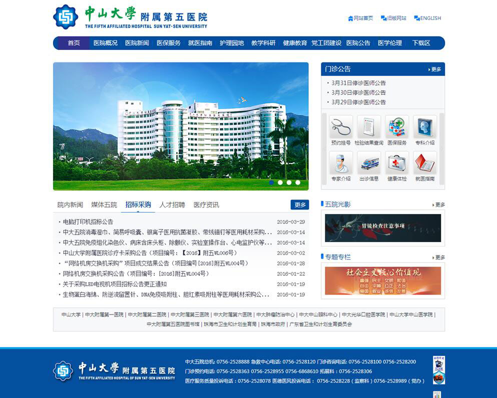 中山大學附屬第五醫院位于珠海市美麗的香洲灣畔,情侶路旁,環山臨海,環境幽靜,風景秀麗。醫院毗鄰澳門,鄰近碼頭及國際機場,海陸空交通十分便利。