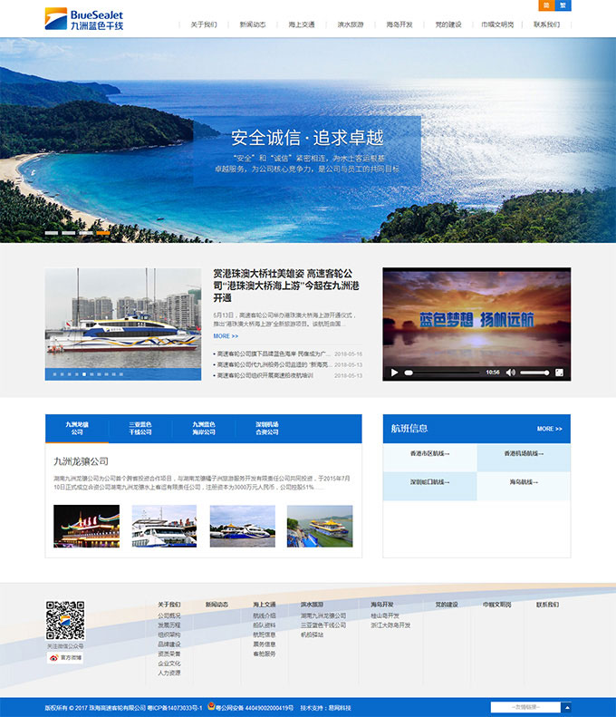 珠海高速客輪有限公司成立于1984年,是珠海九洲控股集團有限公司旗下“藍色海洋旅游”板塊核心企業,也是香港上市公司珠海控股投資集團有限公司的控股企業,主要經營水上客運、海島旅游、民宿旅居、船舶燃料供應等業務,下屬海通船務、九洲郵輪、珠澳輪渡、九洲能源、九洲港加油站、九洲龍驤、九洲藍色海岸、三亞藍色干線、海昌投資、海喬投資等十余家股權投資企業。公司現擁有14艘豪華高速客輪和30多艘豪華游船及游艇,在建及計劃建造多艘新型豪華高速客船及游船,年客運量逾400萬人次,連續多年位居粵港水路 首頁位,是內地規模最大、實力雄厚的水上高速客運及旅游觀光企業。